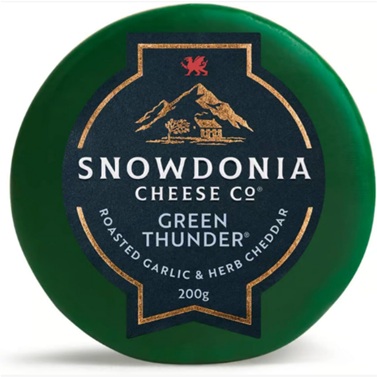 Green Thunder (200g) - A sensationally savoury mature Cheddar with roasted garlic and aromatic garden herbs .