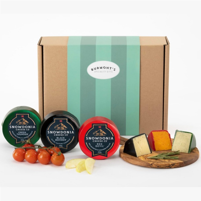 This cheese & chutney hamper includes 3 speciality cheeses plus 2 chutneys from the award winning Snowdonia Cheese Company: