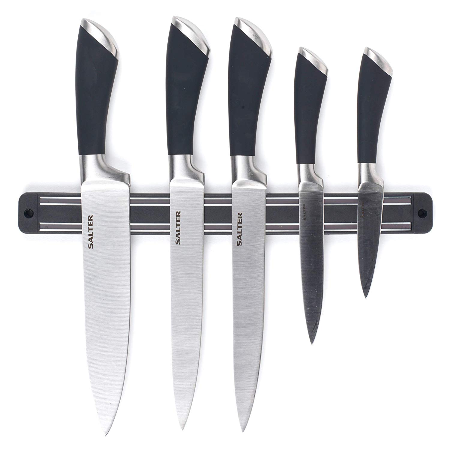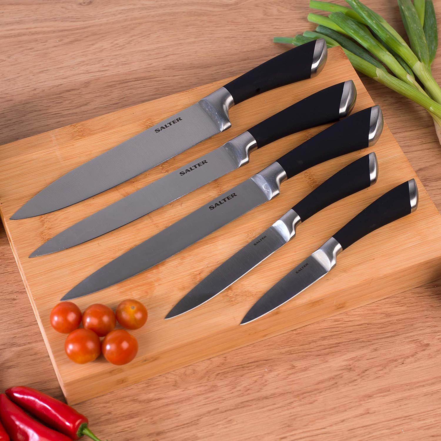 This five piece Salter Elegance knife set will add a nice touch to your kitchen and it consists of a large 8” chef knife, a smaller 5” santoku knife, carving knife, utility knife and a 3.5” paring knife. A perfect combination of knives and sizes for preparing food.