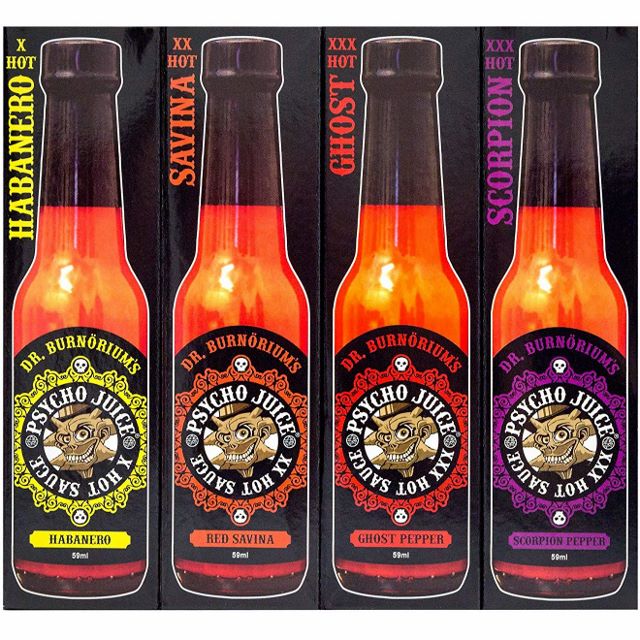 Dr. Burnörium says: My Psycho Juice Mini Four Packs are a great gift for the serious chillihead. Quality, heat, amazing flavour, they’ve got the lot. As with all my Psycho products only the best will do. I sincerely hope you enjoy them as much as I enjoyed creating them.